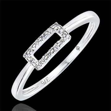 Una montatura minimalista e geometrica, formata da una cornice rettangolare pavé. Un anello contemporaneo, un gioiello da indossare nel quotidiano.