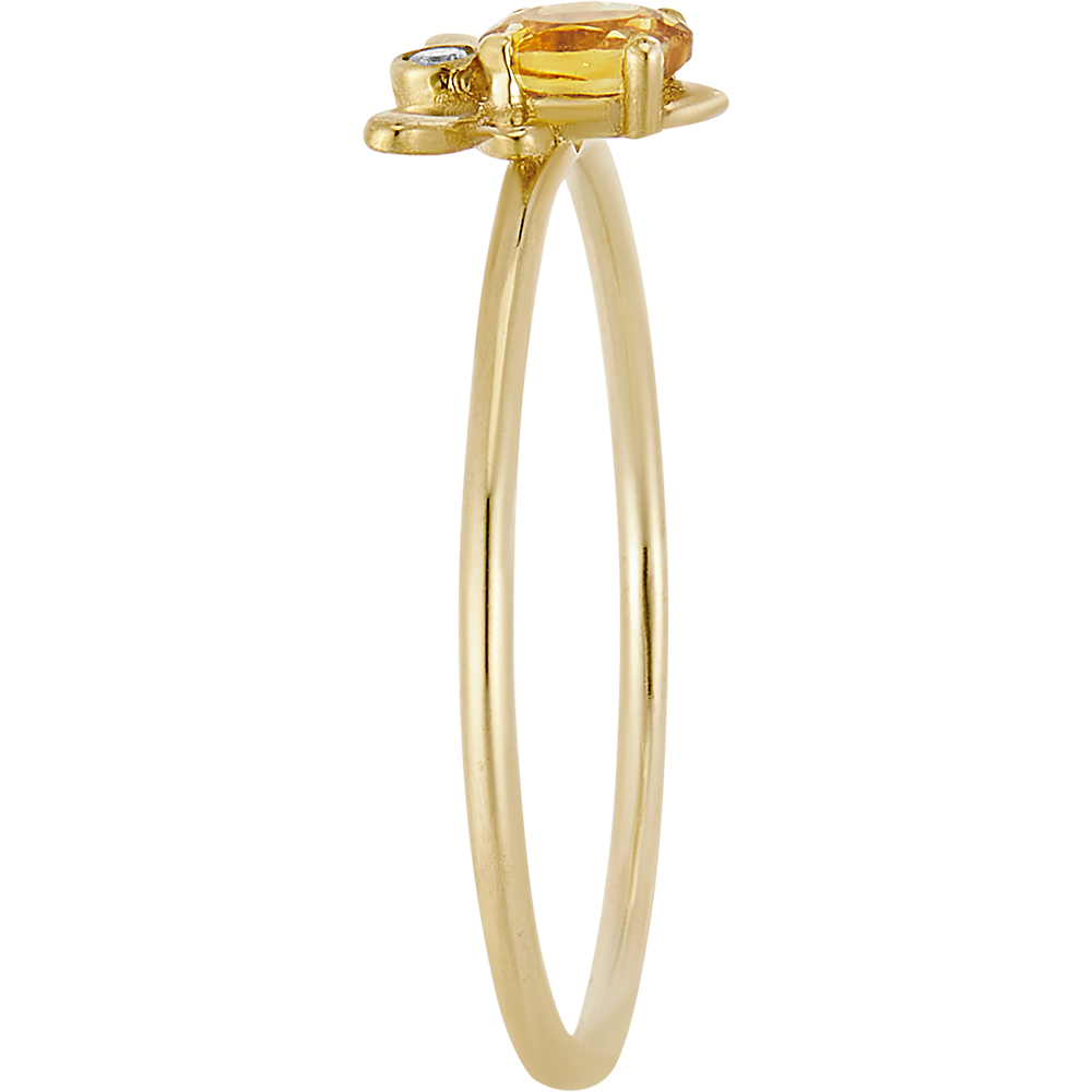 L’anello Ape Pop in oro giallo rappresenta l’ape regina con un’ape delicatamente posata su un anello in oro giallo, composta da un citrino ovale di 4x3 mm e da un diamante di laboratorio.
