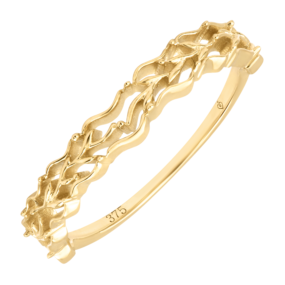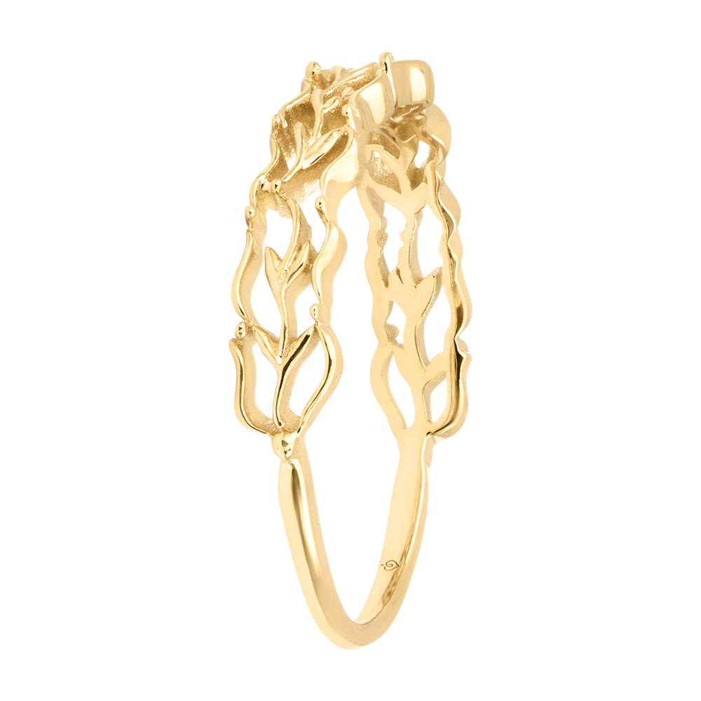 Un motivo cesellato, organico e fluido, percorre la fascia evocando le arabeschi di un fogliame in movimento.Un anello scultoreo e poetico, come un frammento dorato della natura.