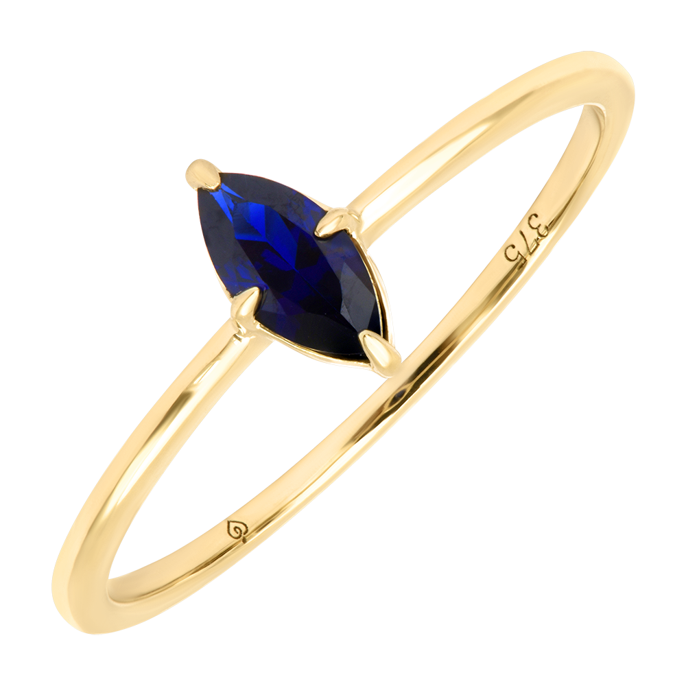 Lo zaffiro sintetico è taglio marquise e pesa 0,3 carati, offrendo brillantezza delicata e forma elegante.