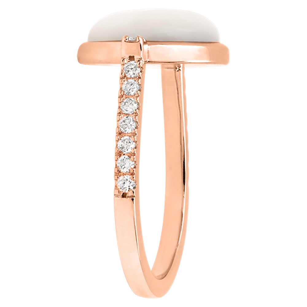 Elegante e luminosa, l’anello Cabochon Aura Nacrée unisce la delicatezza di un cabochon in madreperla bianca con lo splendore dei diamanti incastonati in oro . Il design essenziale valorizza la pietra centrale aggiungendo un tocco moderno e raffinato. Da indossare da solo o abbinato alle nostre fedi Contour — lisce o con pavé di diamanti — per creare il trio Romance Moderne, una perfetta fusione tra minimalismo e femminilità.