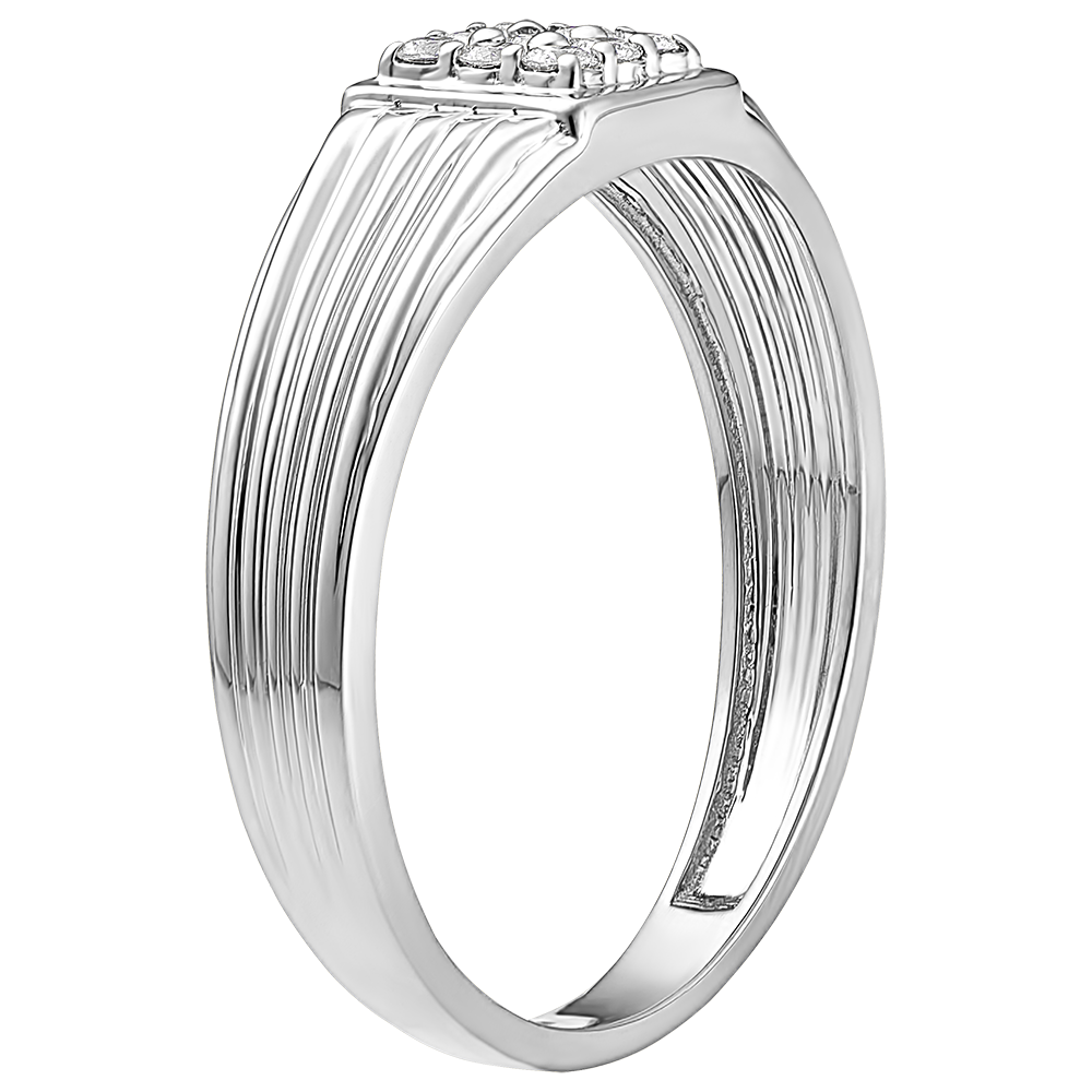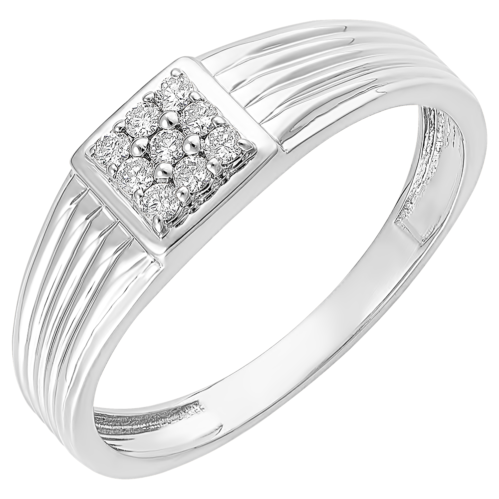 Una chevalière dal piano in oro bianco delicatamente zigrinato e il cui centro è impreziosito da un pavé di 9 diamanti.