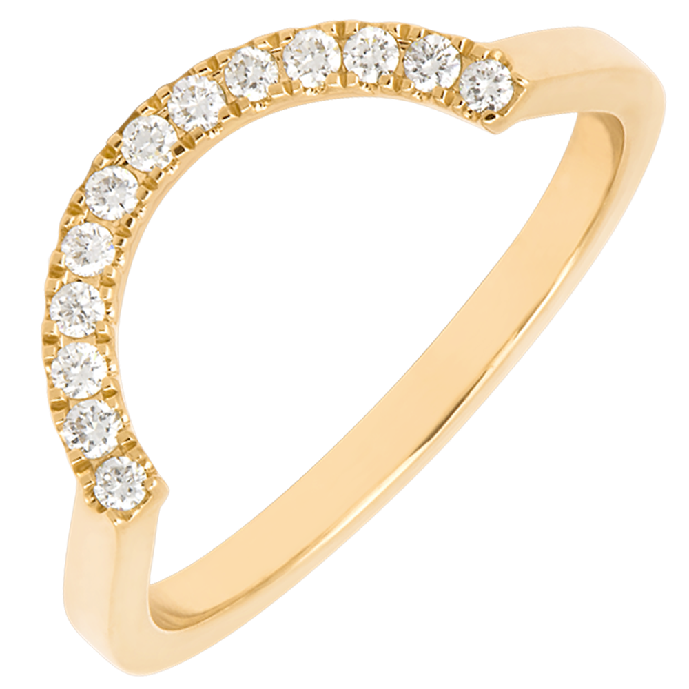 La Fede nuziale Contour con diamanti aggiunge un tocco di luce in più al trio Romance Moderne. In oro lucido, la sua curva delicata è illuminata da un pavé di diamanti scintillanti che valorizza con finezza la forma dell’anello centrale. Indossata da sola o insieme alla Fede nuziale Contour e all’anello Cabochon Aura Nacrée, rivela tutta la ricchezza di uno stile moderno e raffinato.