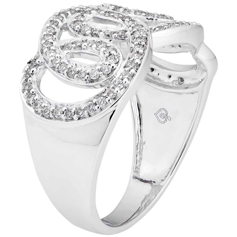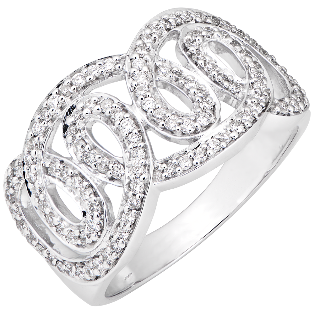 Un anello dai riccioli pavé, che rivisita gli ornamenti imperiali con delicatezza e leggerezza.