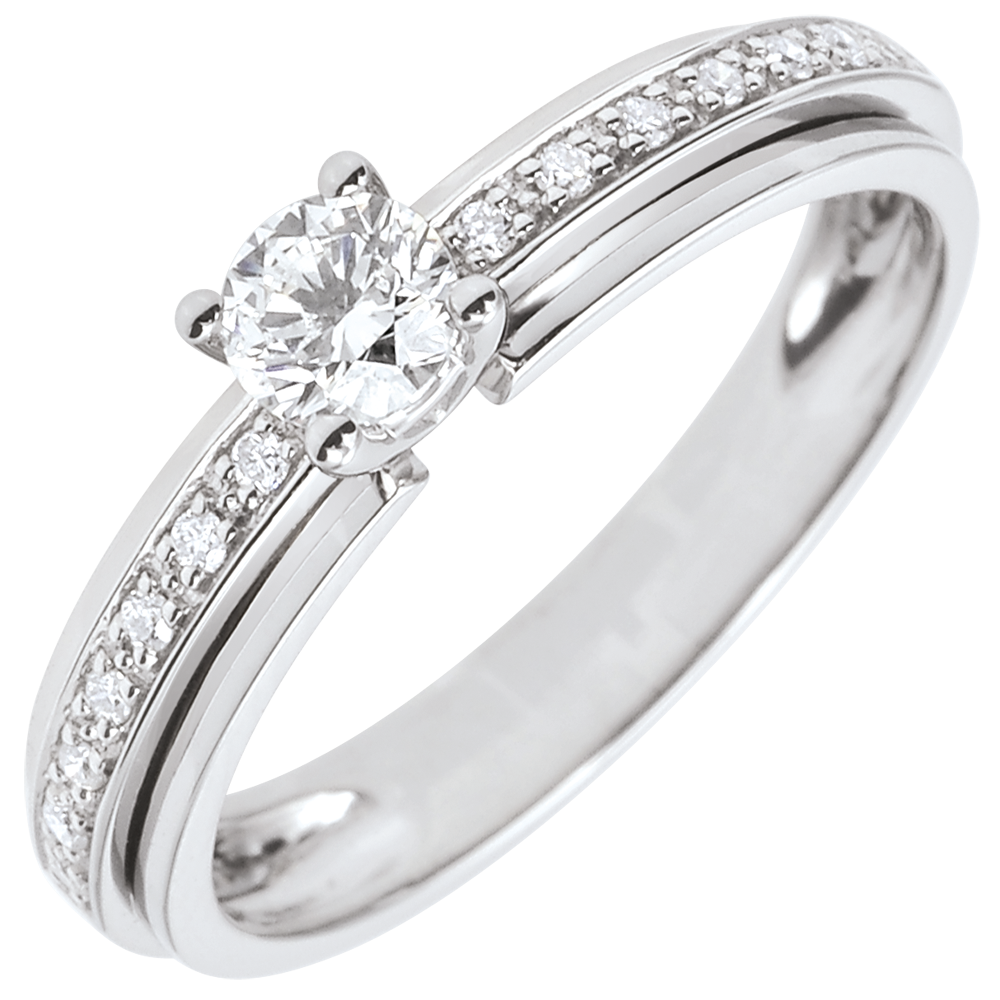 Un diamante solitario su 4 griffe è al centro di una lussuosa montatura in Oro bianco con pavé di diamanti taglio brillante.