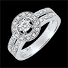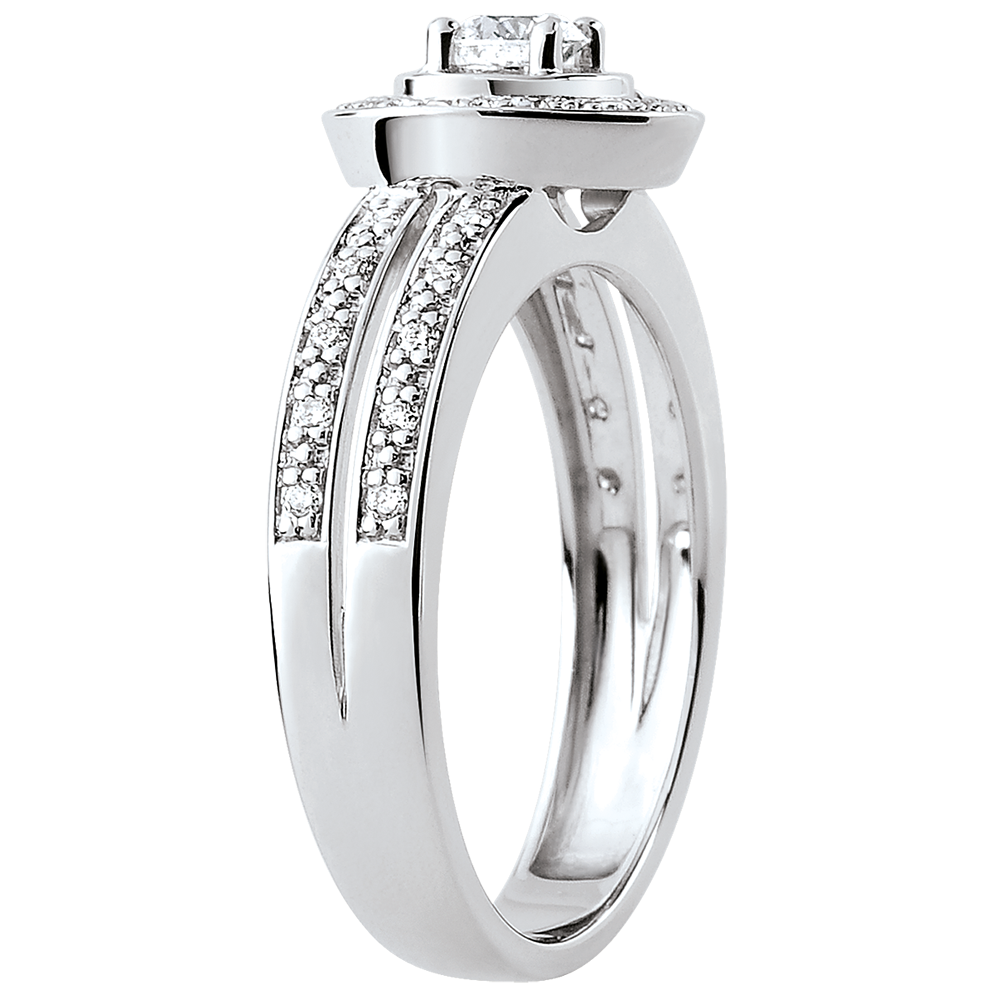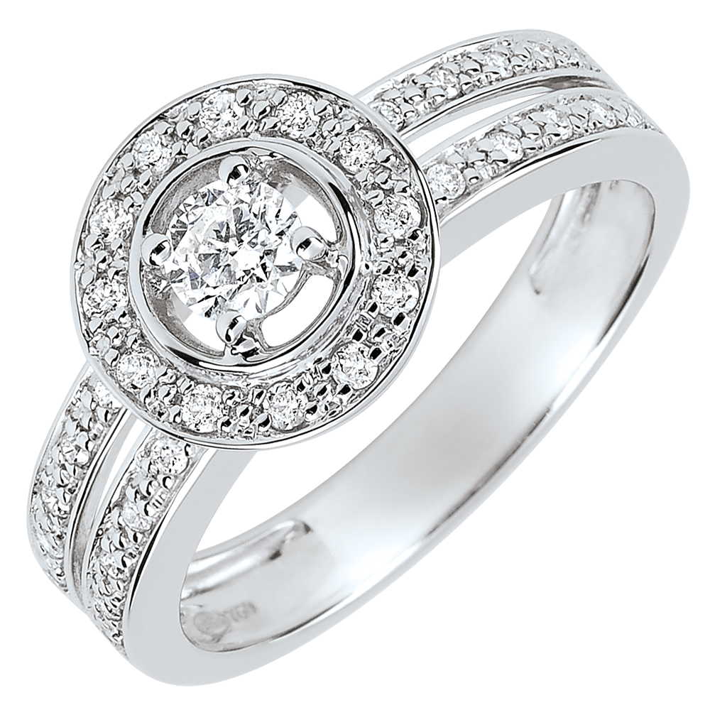 Il diamante centrale è valorizzato con eleganza da uno scrigno di brillanti.Un doppio anello incastonato di diamanti è la base che esalta con brio lo splendore di questo gioiello di fidanzamento in oro bianco.