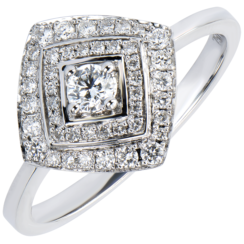 Una montatura grafica e maestosa dal design art-déco, formata da un diamante centrale sublimato da una doppia corona a forma di rombo tempestata di diamanti. Senza dubbio un anello di stile e carattere.
