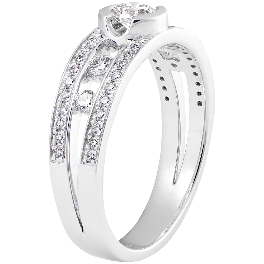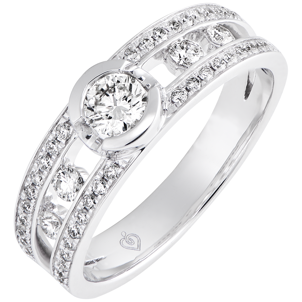 Un diamante centrale a incastonatura chiusa su una montatura a doppia fila pavé, impreziosita da diamanti laterali. Un design classico e senza tempo per un anello raffinato ed elegante.