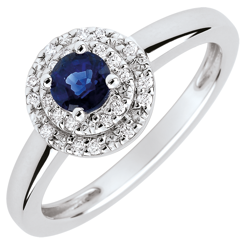 Eleganza senza tempo per questo anello di fidanzamento con uno zaffiro incastonato in una doppia fila di diamanti. Meraviglia e romanticismo per questo solitario accompagnato.