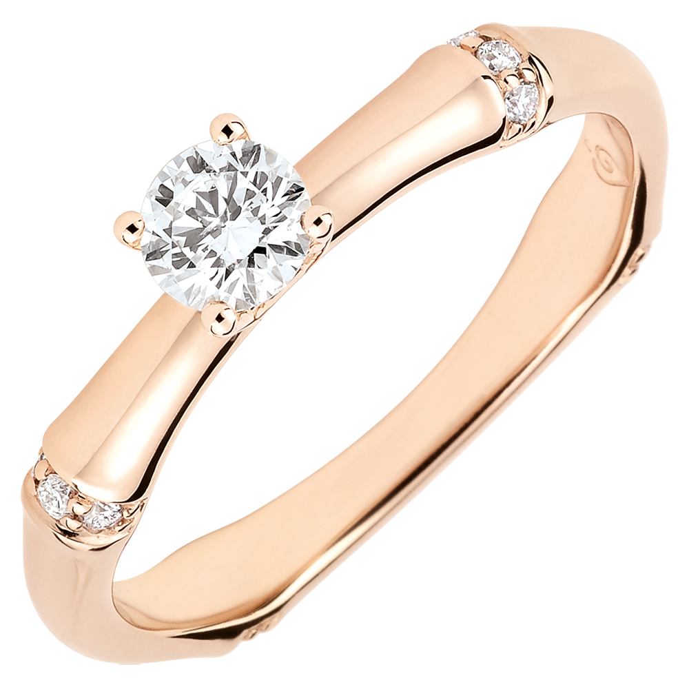 Un ramo di bambù solido e flessibile si trasforma in un Anello di Fidanzamento eterno. I nodi di bambù sono intarsiati con diamanti in oro rosa con diamante solitario sublime.