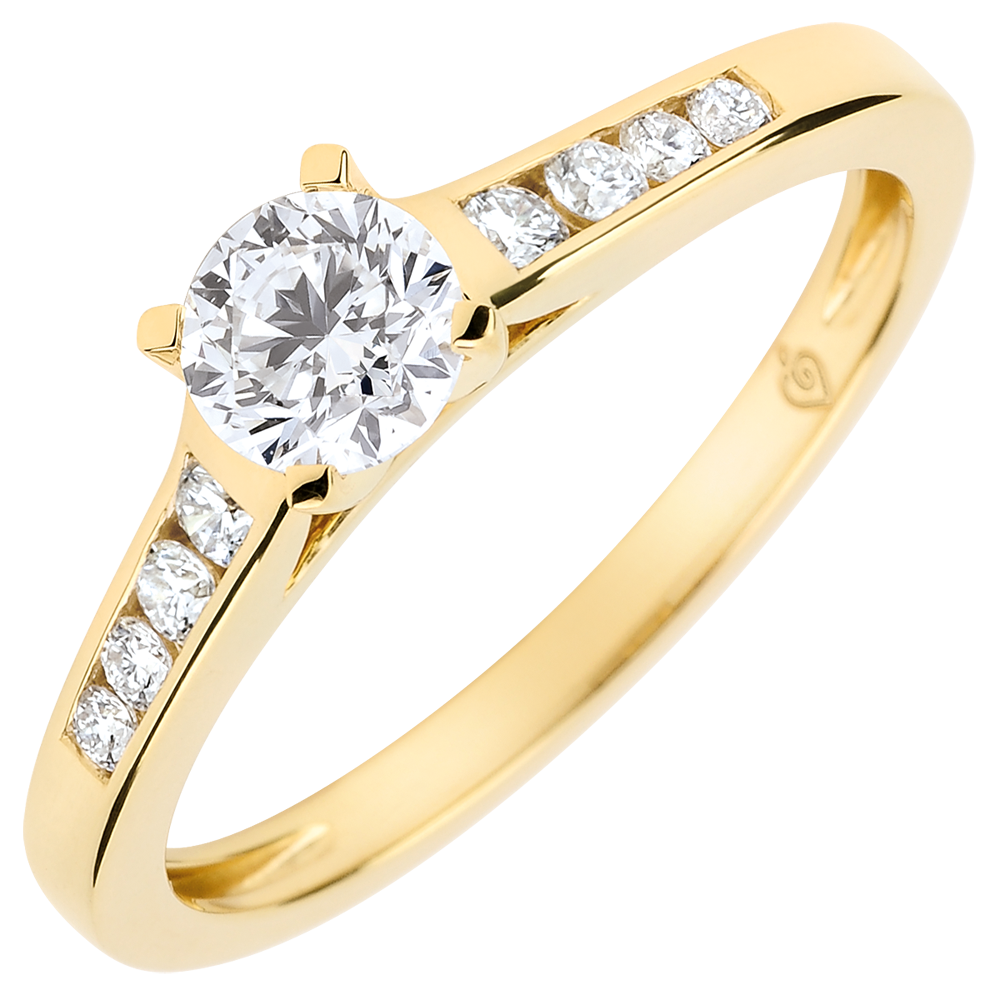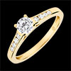 L'essenzialità di un solitario oro giallo, esaltato da un corteo di brillanti. Una montatura delicata e senza tempo.