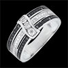 Tre sublimi diamanti incastonati nell'Oro bianco lavorato a diamante risplendono al centro di questa montatura a tre anelli, impreziositi anch'essi da diamanti.
