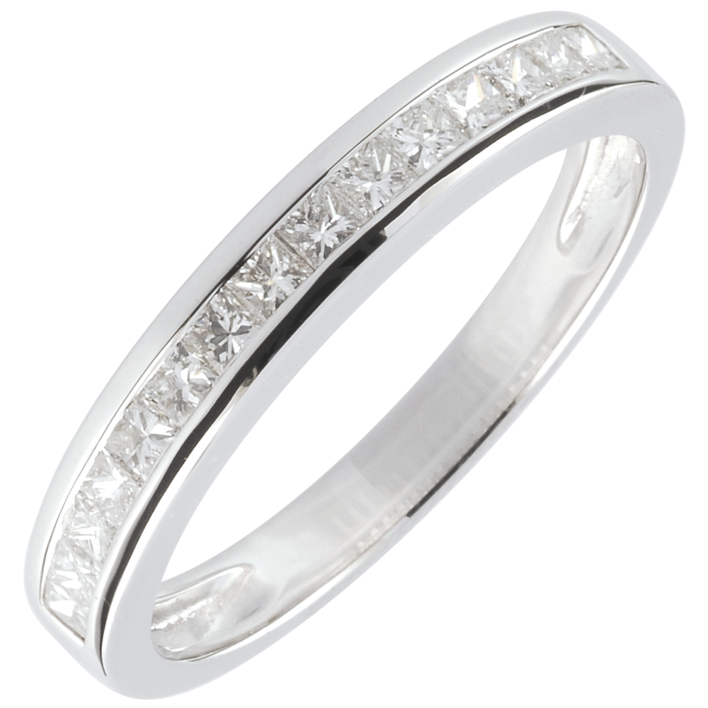 Quindici diamanti taglio principessa sfilano su questa fede dall'eleganza senza tempo.
