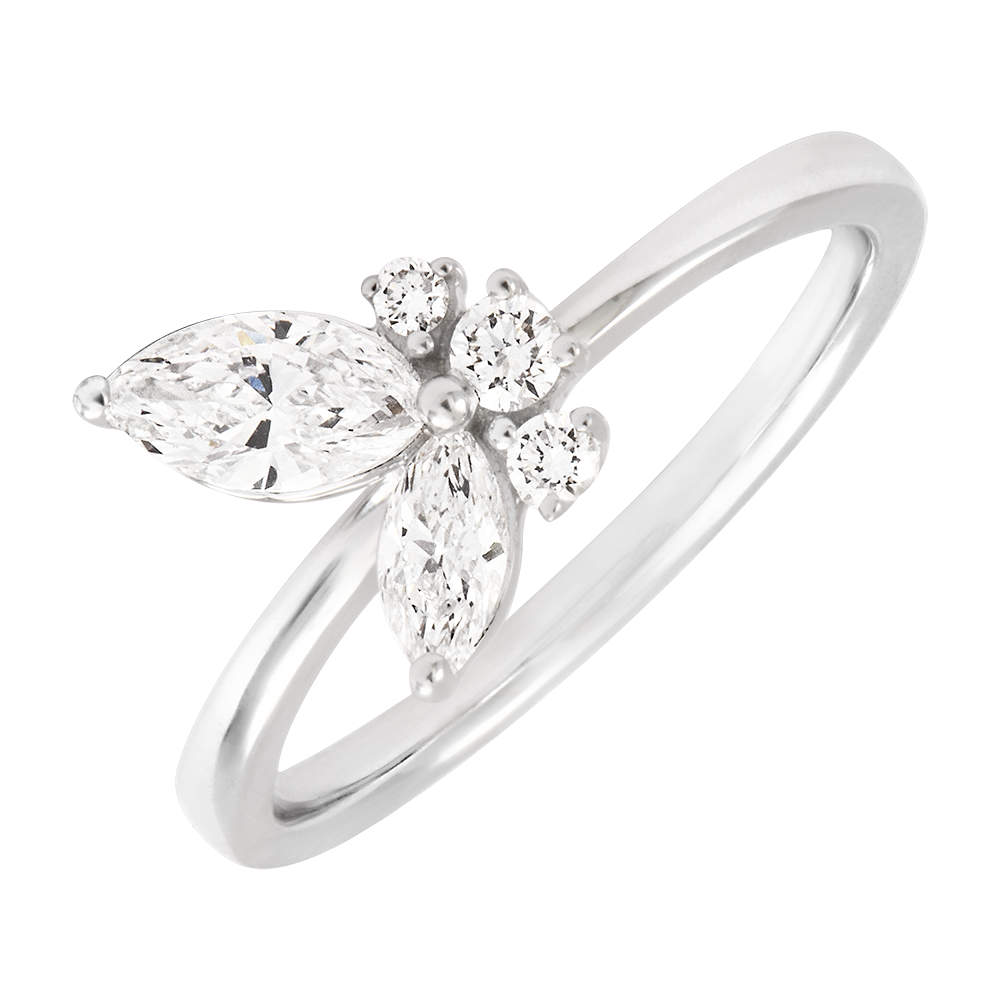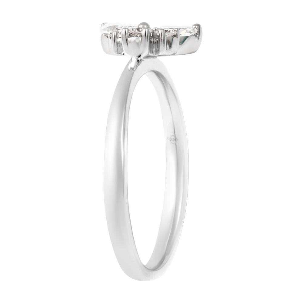 L’anello "Farfalla di Mezzanotte" in oro bianco 18 carati è impreziosito da cinque diamanti sintetici taglio marquise e rotondo che formano un delicato motivo a farfalla. Un gioiello elegante che dona grazia alla mano.