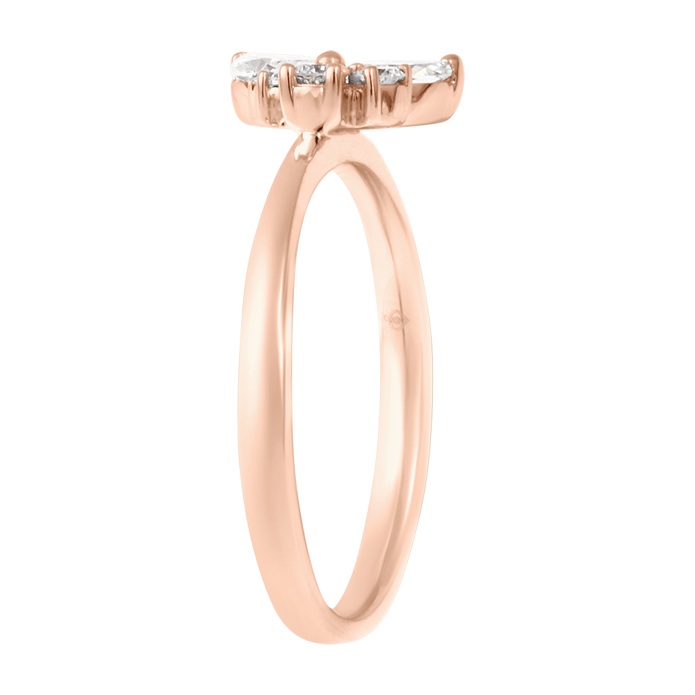 L’anello "Farfalla di Mezzanotte" in oro rosa 9 carati è impreziosito da cinque diamanti sintetici taglio marquise e rotondo che formano un delicato motivo a farfalla.