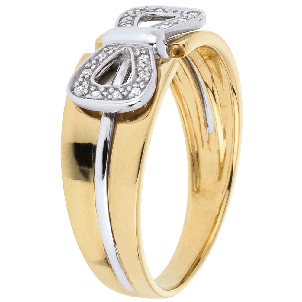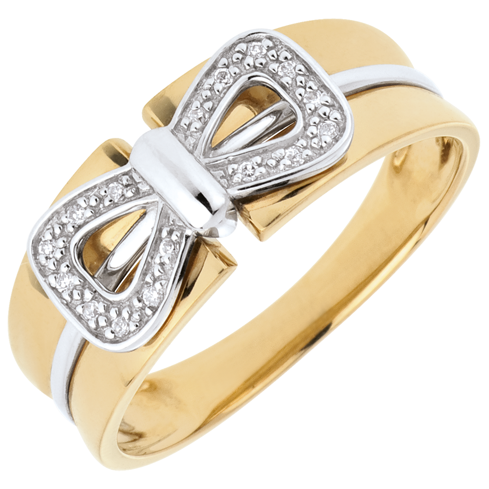Un corsetto in Oro giallo contornato d'Oro bianco, esaltato da un nodo splendente in Oro bianco e diamanti.