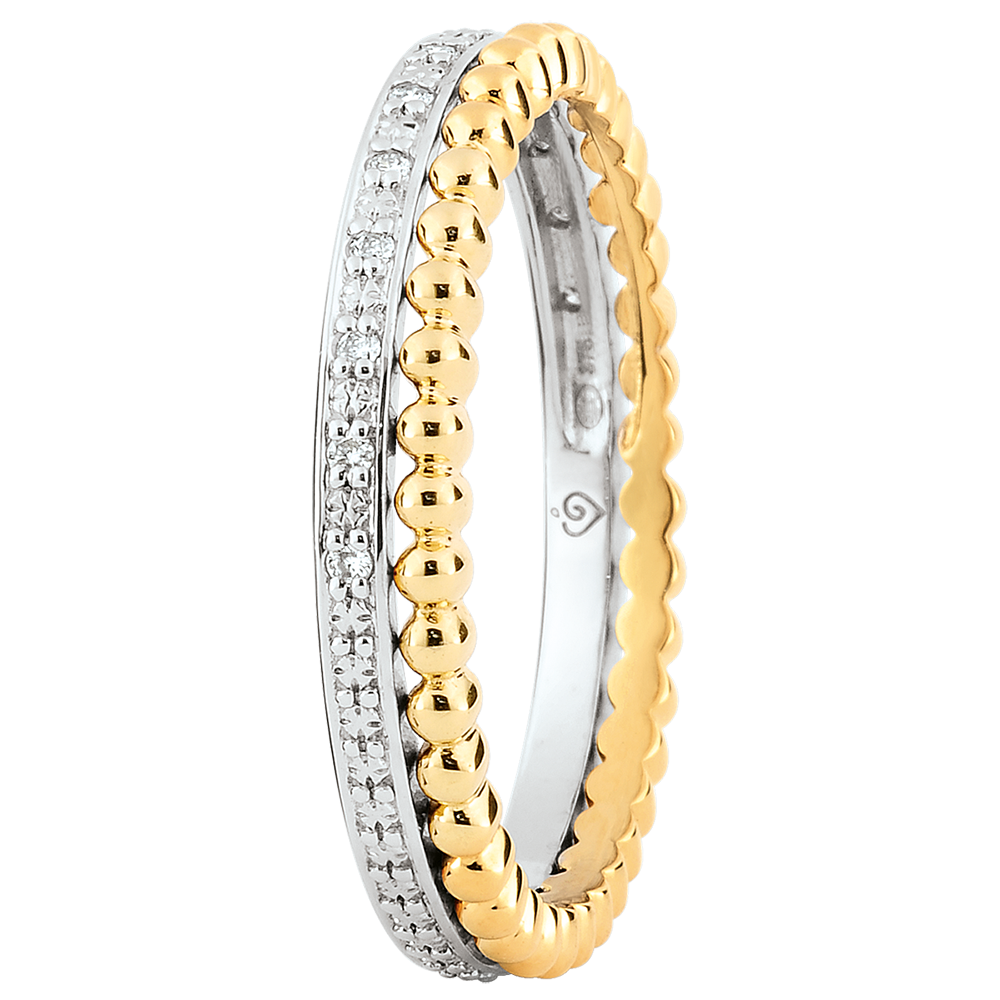 Un anello in oro bianco incastonato di diamanti si unisce a un anello di perle in oro giallo per dare vita a un duetto delicato.