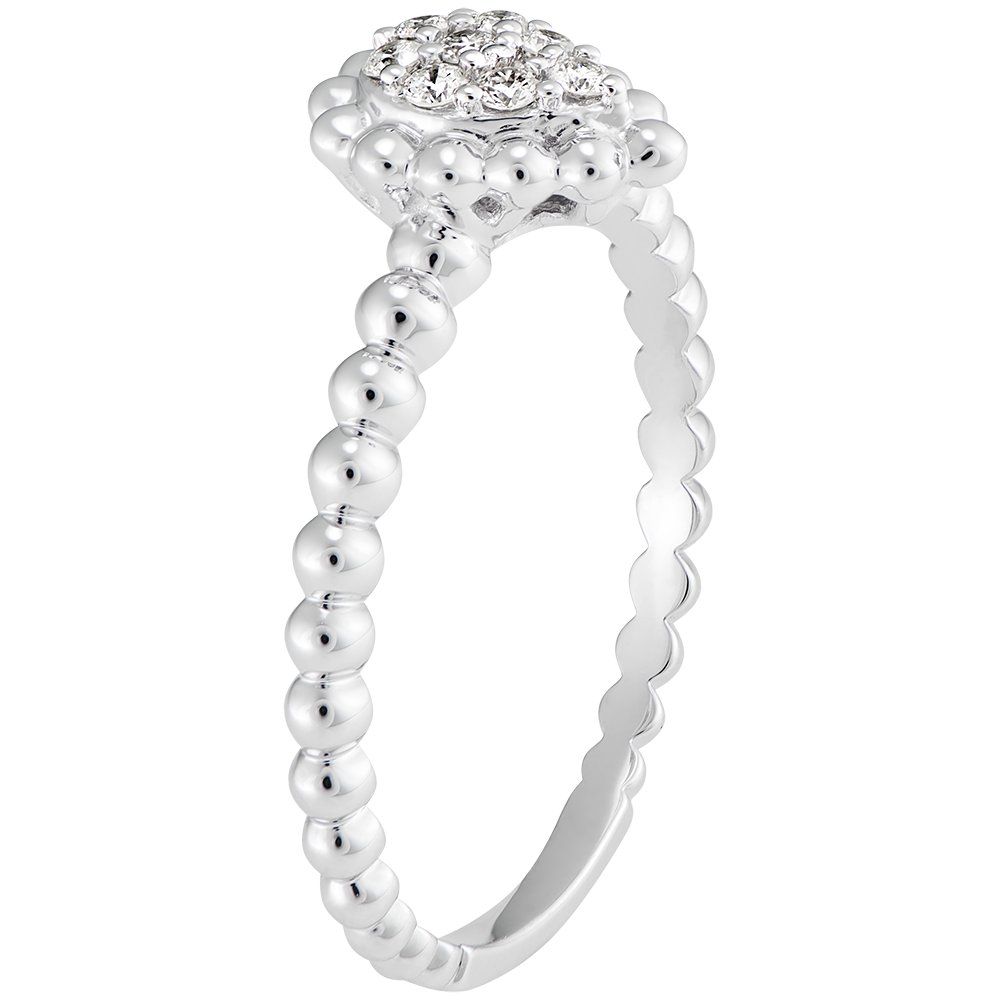 Un cluster di diamanti su una montatura perlata per un anello che racchiude dolcezza e delicatezza.