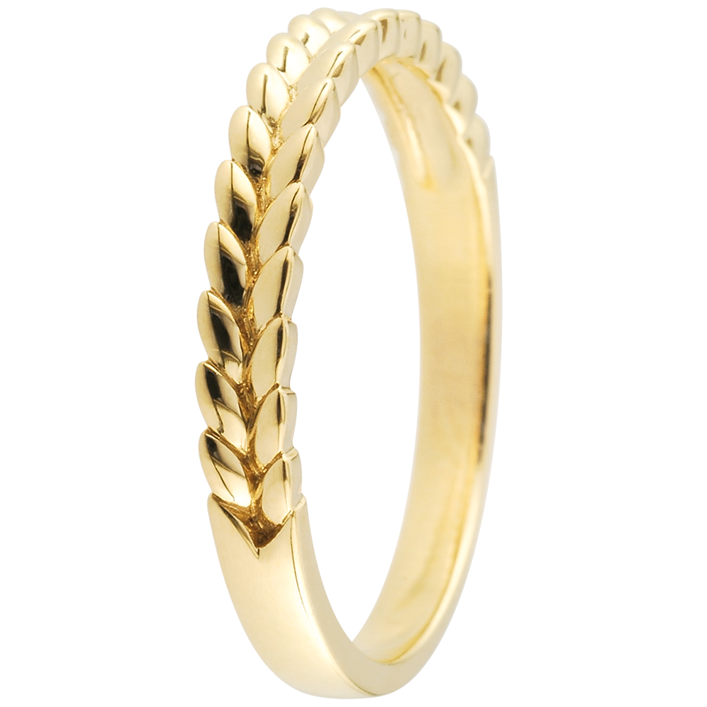 Un anello con un motivo di foglie d'Oro intrecciate sulla metà superiore. Perfetto come fede originale e raffinata o come anello da abbinare ad altri bijoux.