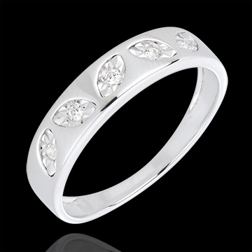 Un raffinato anello in Oro bianco, ornato da cinque foglioline stilizzate impreziosite da un diamante.