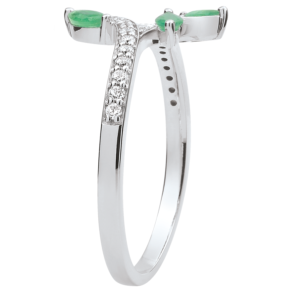 Un ramoscello sfavillante è fissato in un attimo senza tempo. Le sue foglie preziose, le navette in smeraldo, sono sublimate dall'oro bianco incastonato di brillanti che fa loro da scrigno.