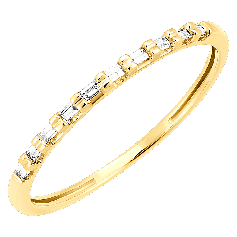 Questo anello in oro giallo è incastonato con diamanti taglio smeraldo che catturano la luce, evocando una sinfonia di riflessi e brillantezza.