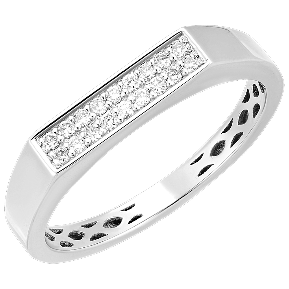 Un anello sofisticato in oro bianco, con una fascia centrale incastonata di 18 diamanti scintillanti per un design dalle linee pulite.