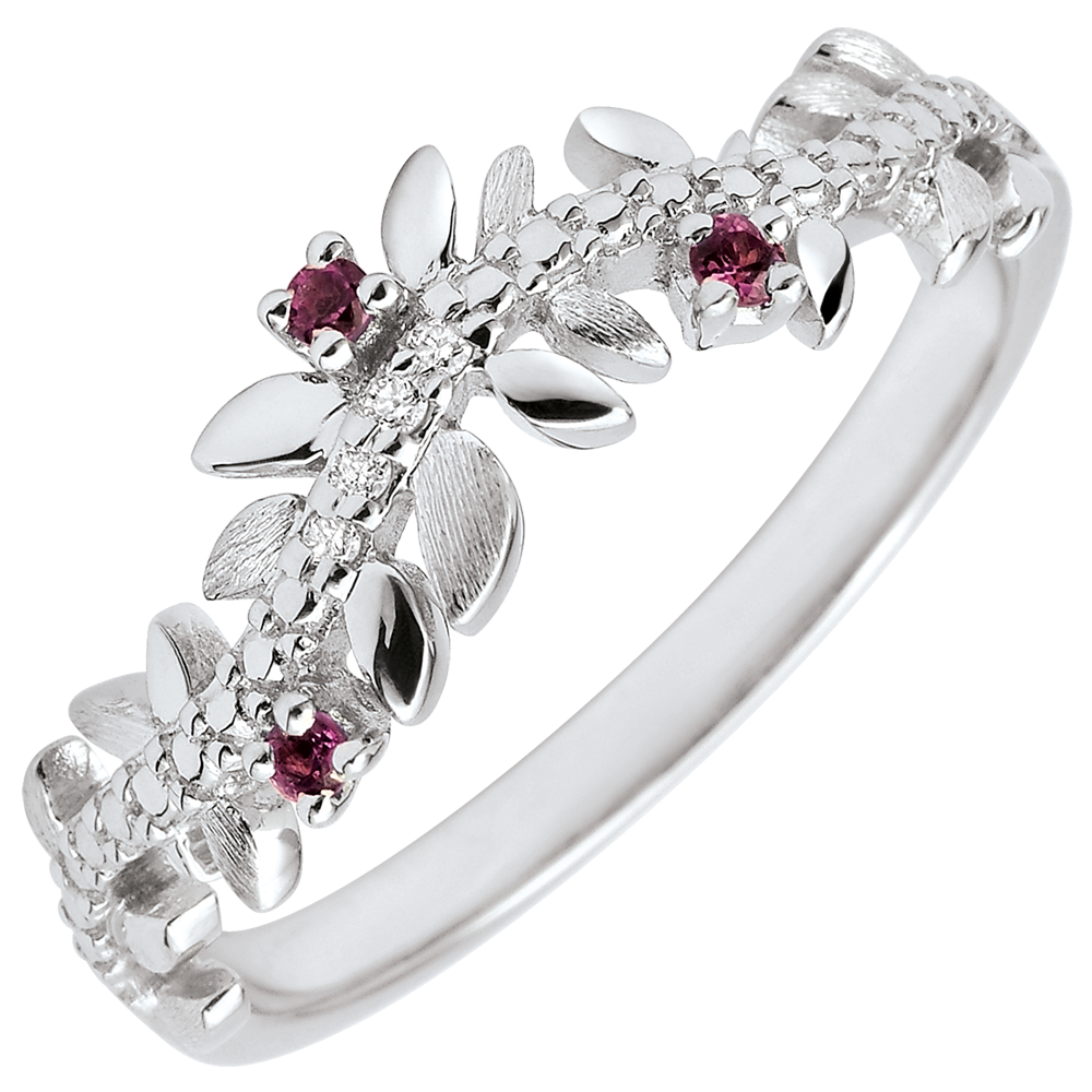 Un'alternanza di foglie in oro bianco brillante e di foglie in oro rifinite a mano per un anello romantico incastonato di diamanti e rodoliti.
