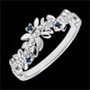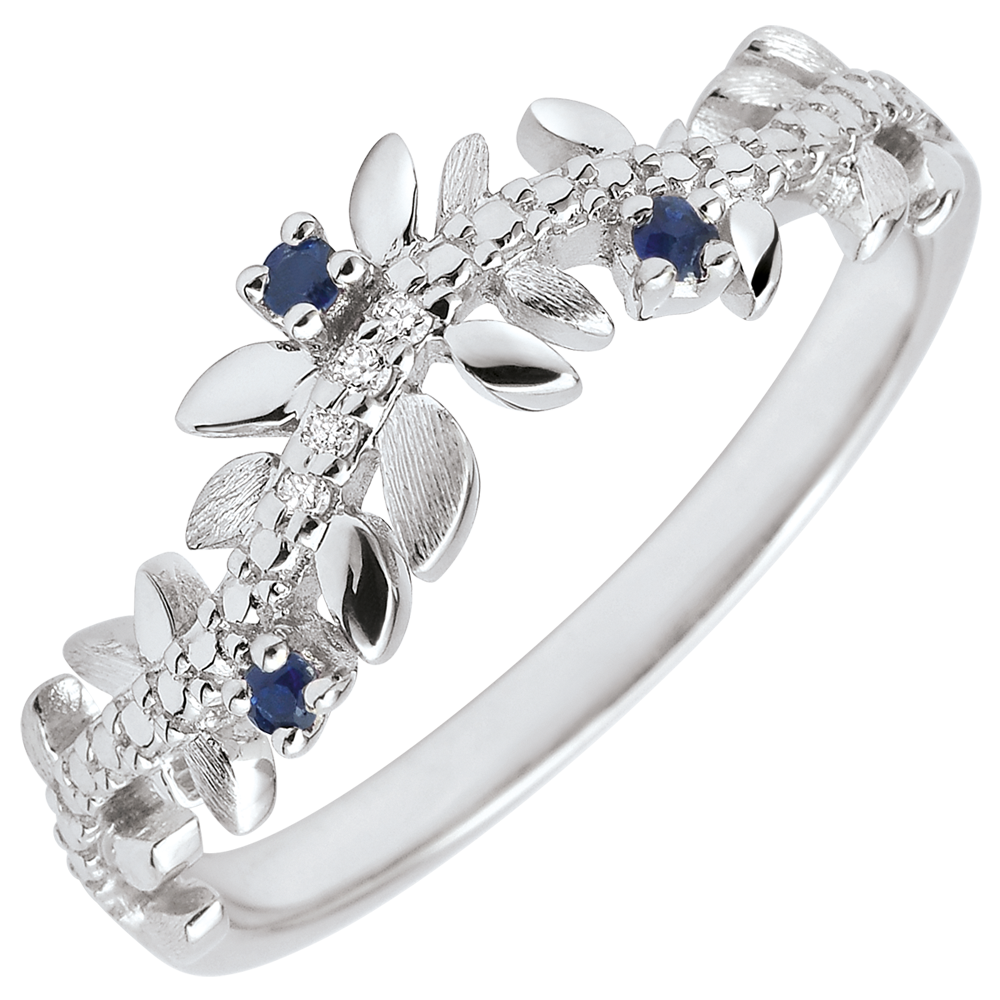 Un'alternanza di foglie in oro bianco brillante e di foglie in oro rifinite a mano per un anello romantico incastonato di diamanti e zaffiri.