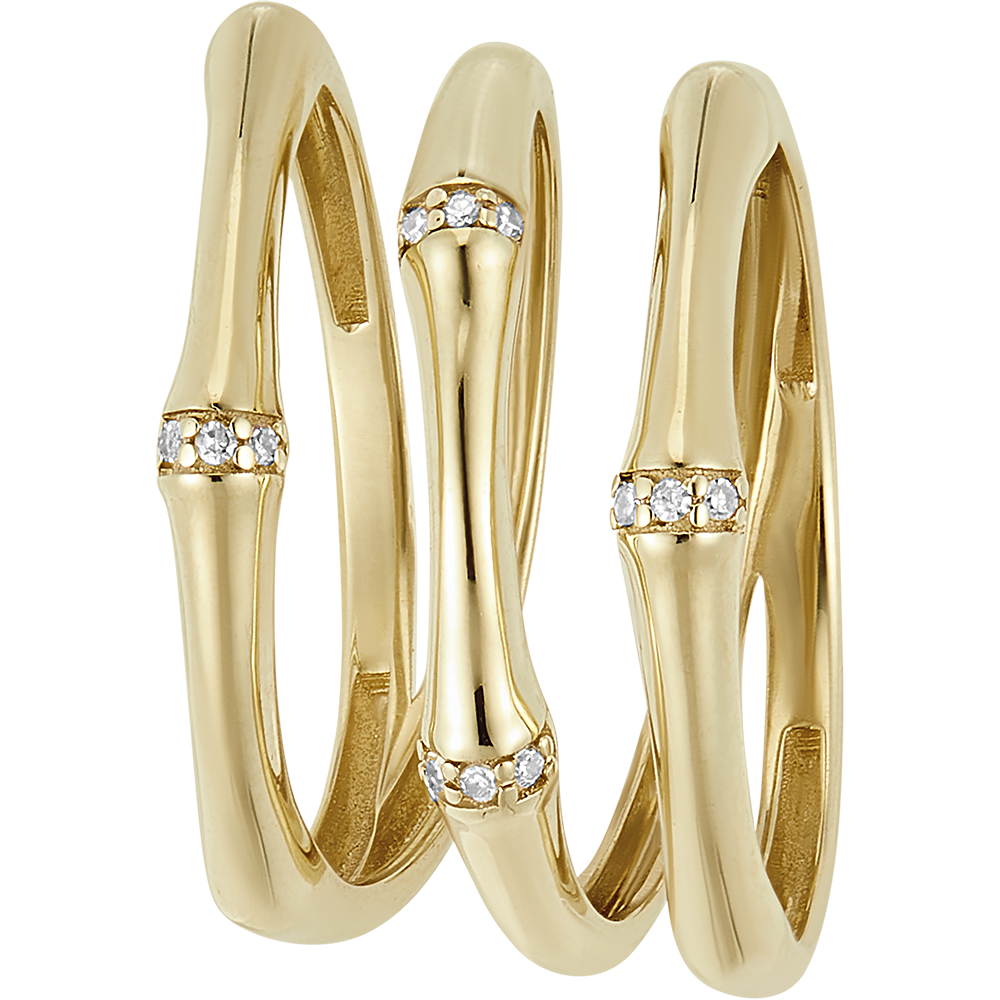 Un ramo di bambù solido e flessibile si avvolge attorno al dito per trasformarsi in un anello dal fascino eterno. I nodi del bambù sono impreziositi da diamanti.