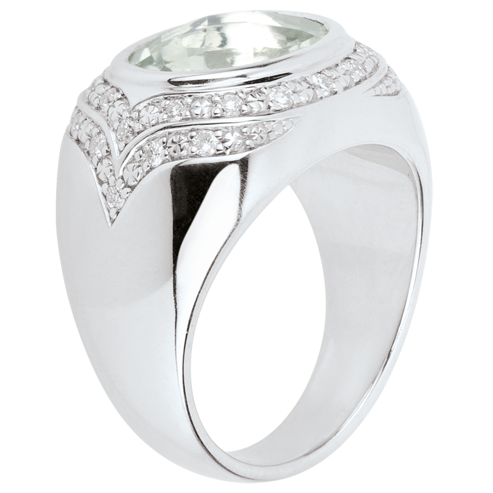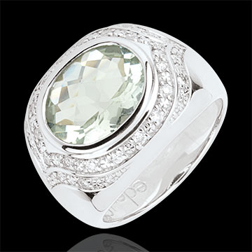 Un'ametista verde ovale circondata da due file di diamanti, per assomigliare all'occhio prezioso di una divinità.