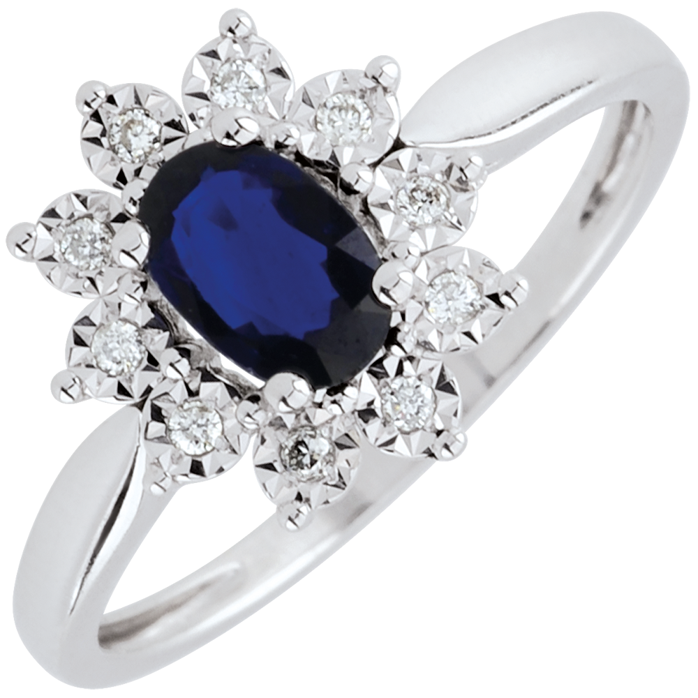 Uno zaffiro ovale è il centro di un fiore prezioso in oro bianco dai petali tempestati di diamanti.