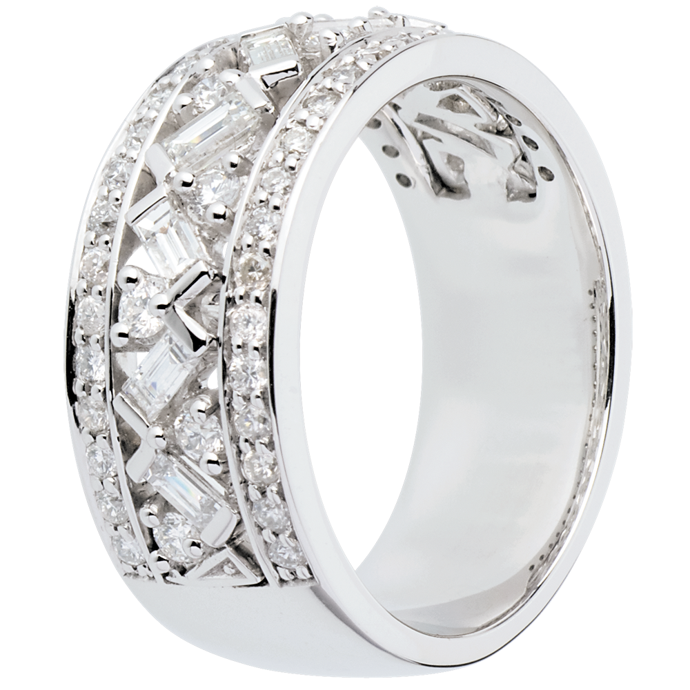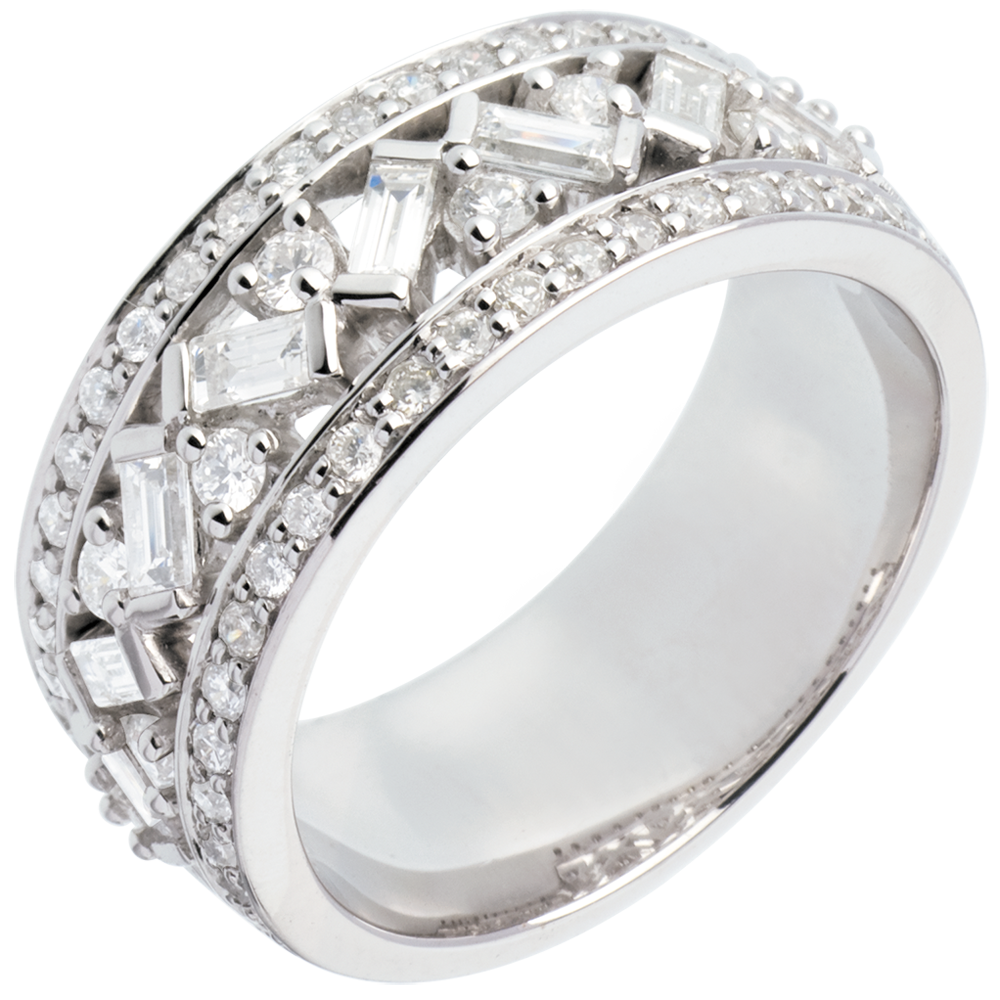 La grazia imperiale di una montatura incoronata di diamanti Brillanti e Bacchette.