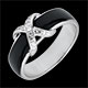 Una fascia in Oro bianco laccato nero è abbracciata da un motivo incrociato in Oro bianco impreziosito da diamanti..
