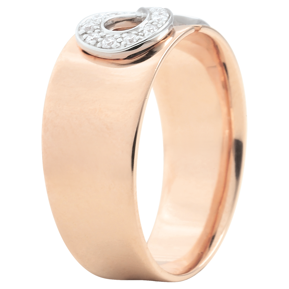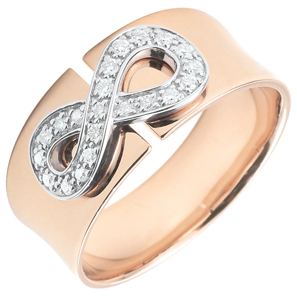 Un segno infinito in oro rosa incastonato di diamanti troneggia su una montatura larga e preziosa. È il simbolo di un'eternità assoluta.