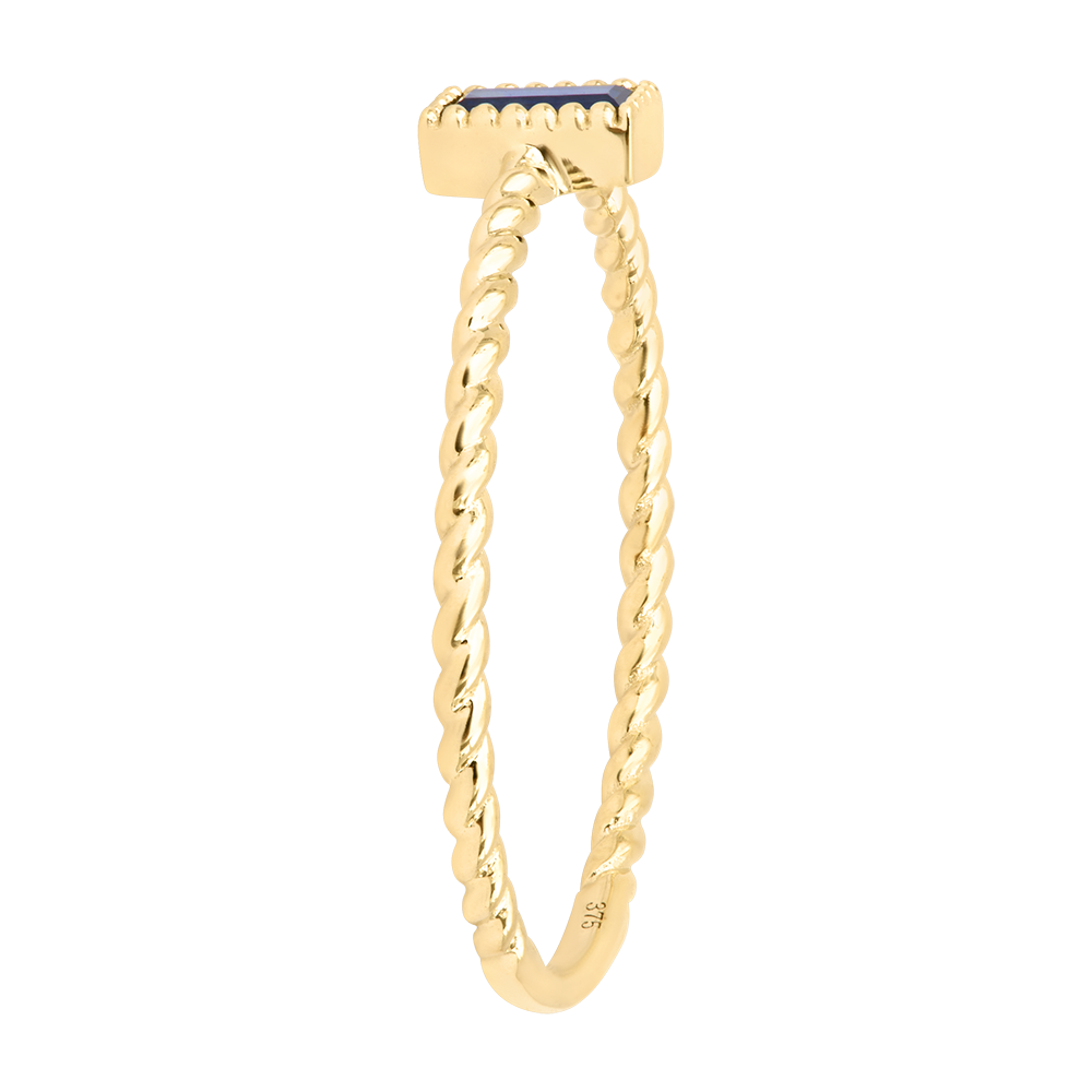 L’anello Maelis presenta uno zaffiro sintetico taglio rettangolare abbinato a un diamante sintetico tondo, montati su una fascia intrecciata in oro giallo 9 carati. Questo duo grafico unisce splendore regale e moderna discrezione.