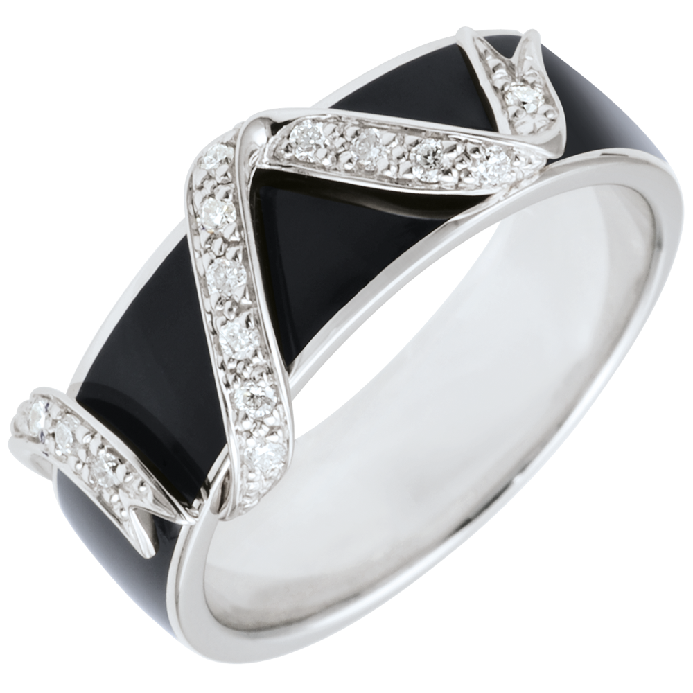 Una larga fascia nera in Oro bianco laccato è percorsa da un delicato nastro d'Oro bianco impreziosito da diamanti. Eleganza allo stato puro.