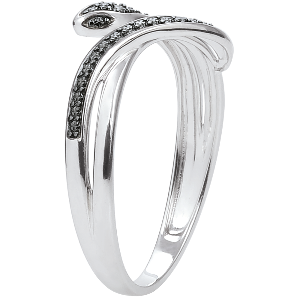 Questo anello serpente d'oro bianco dalle forme sinuose ed affascinanti è adornato di diamanti neri per un aspetto elegante e moderno.