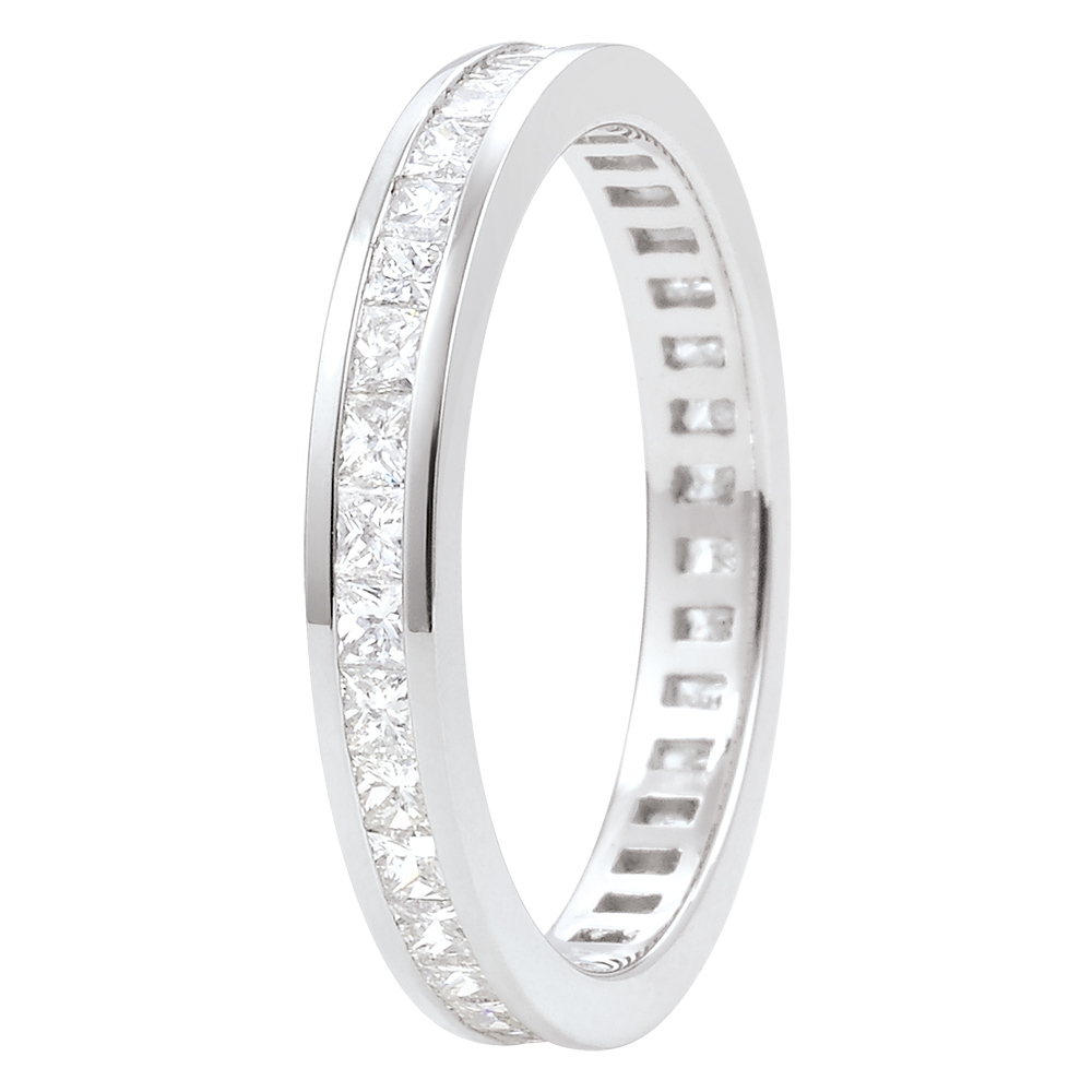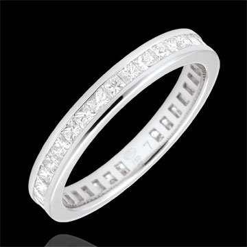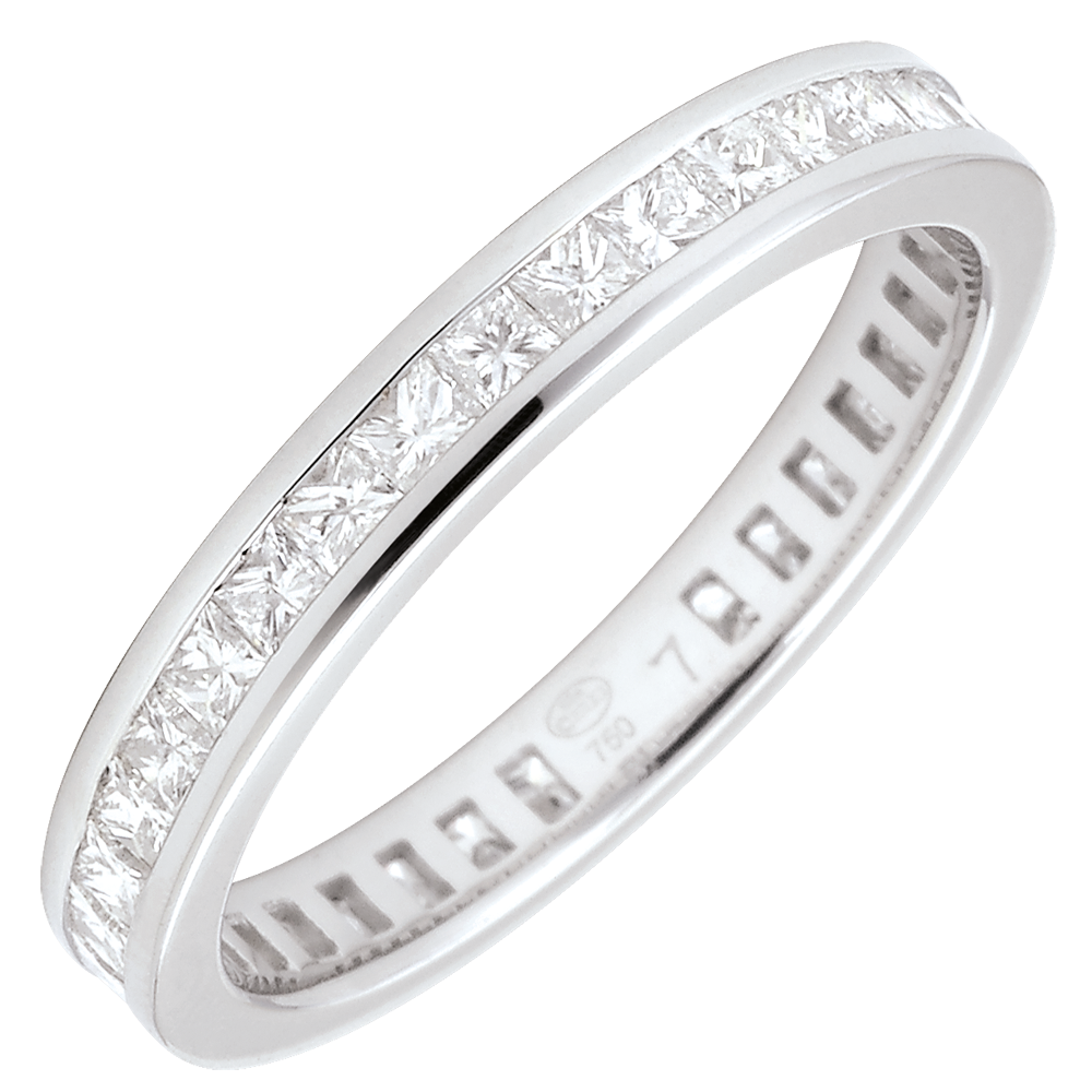 L'equilibrio perfetto di un anello in Oro bianco pavé con 36 diamanti principessa incastonati a binario. Un gioiello indispensabile per un legame speciale.