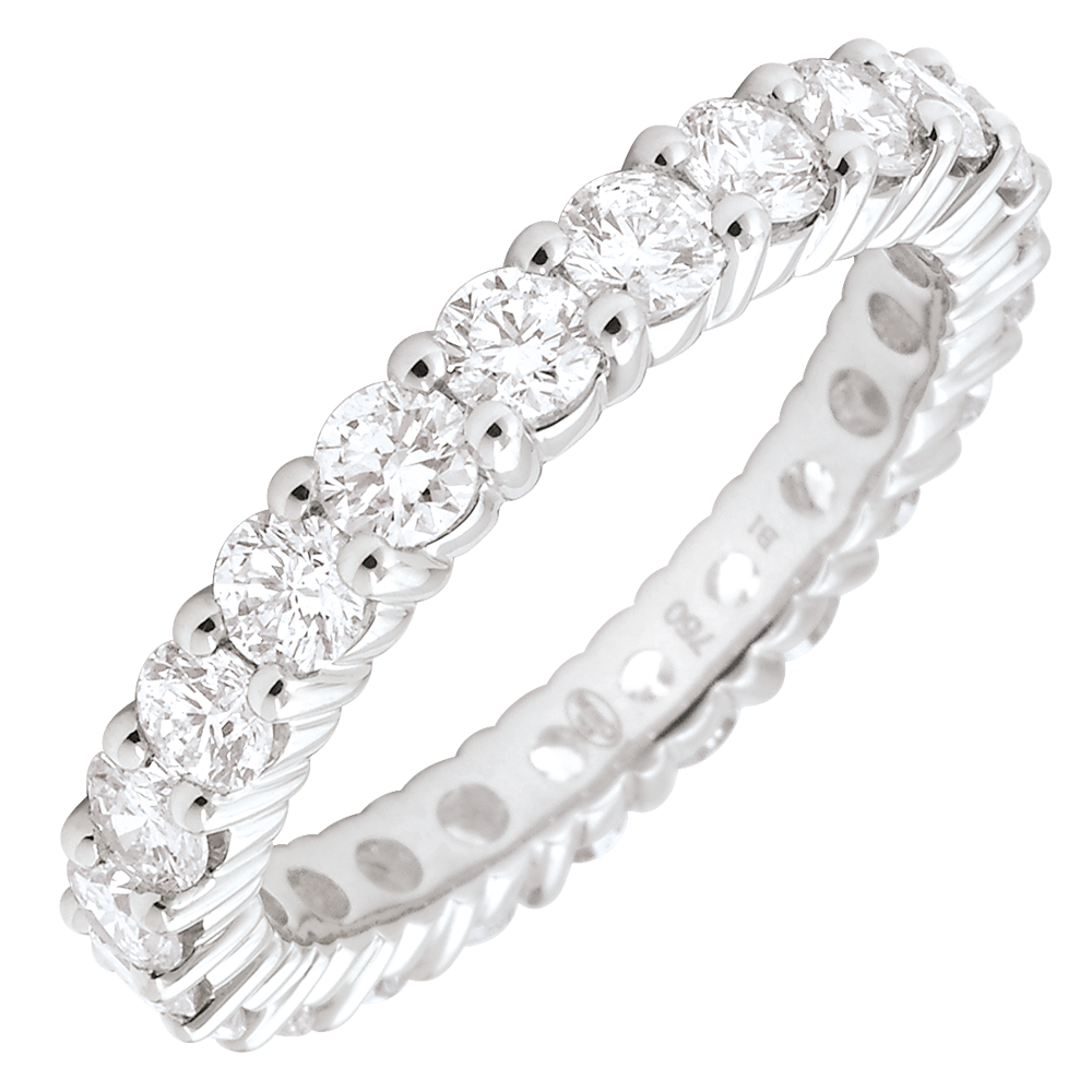 L'equilibrio perfetto di un anello in oro bianco pavé di diamanti rotondi incastonati a griffe per un simbolismo forte. Un gioiello indispensabile per un legame d'eccezione.