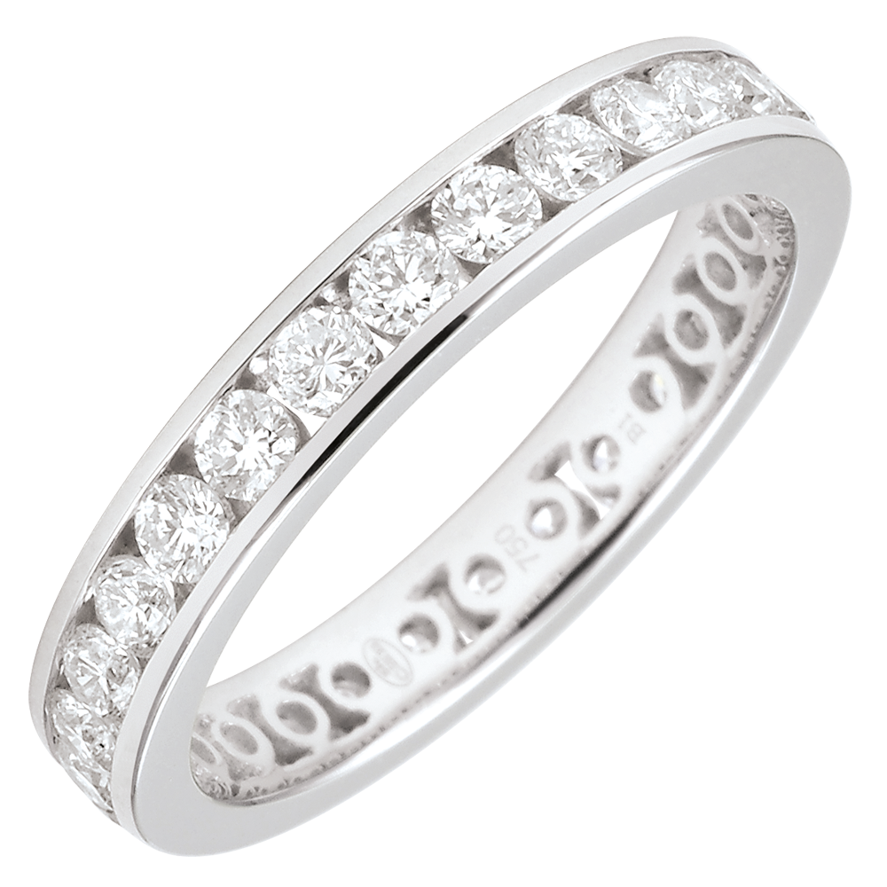 L'equilibrio perfetto di un anello in Oro bianco pavé con 29 Diamanti rotondi incastonati a binario. Un gioiello indispensabile per un legame speciale.