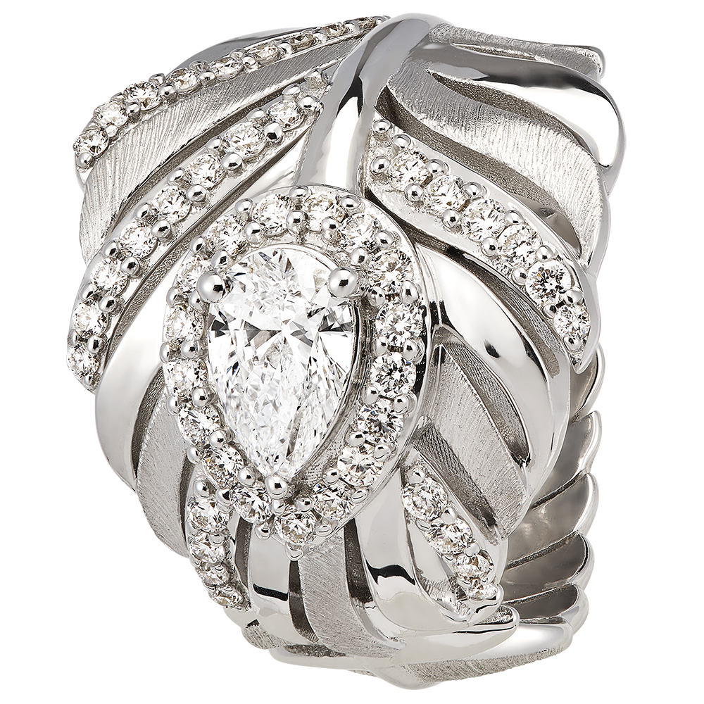L'anello Impériale in oro bianco 18 carati, con i suoi 49 diamanti sintetici, riflette virtuosamente il fasto e l'estetica della collezione Panache. Offre al suo diamante centrale di 0,5 carati, di forma a pera, una vera nobiltà.