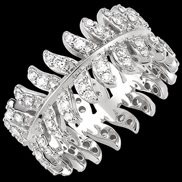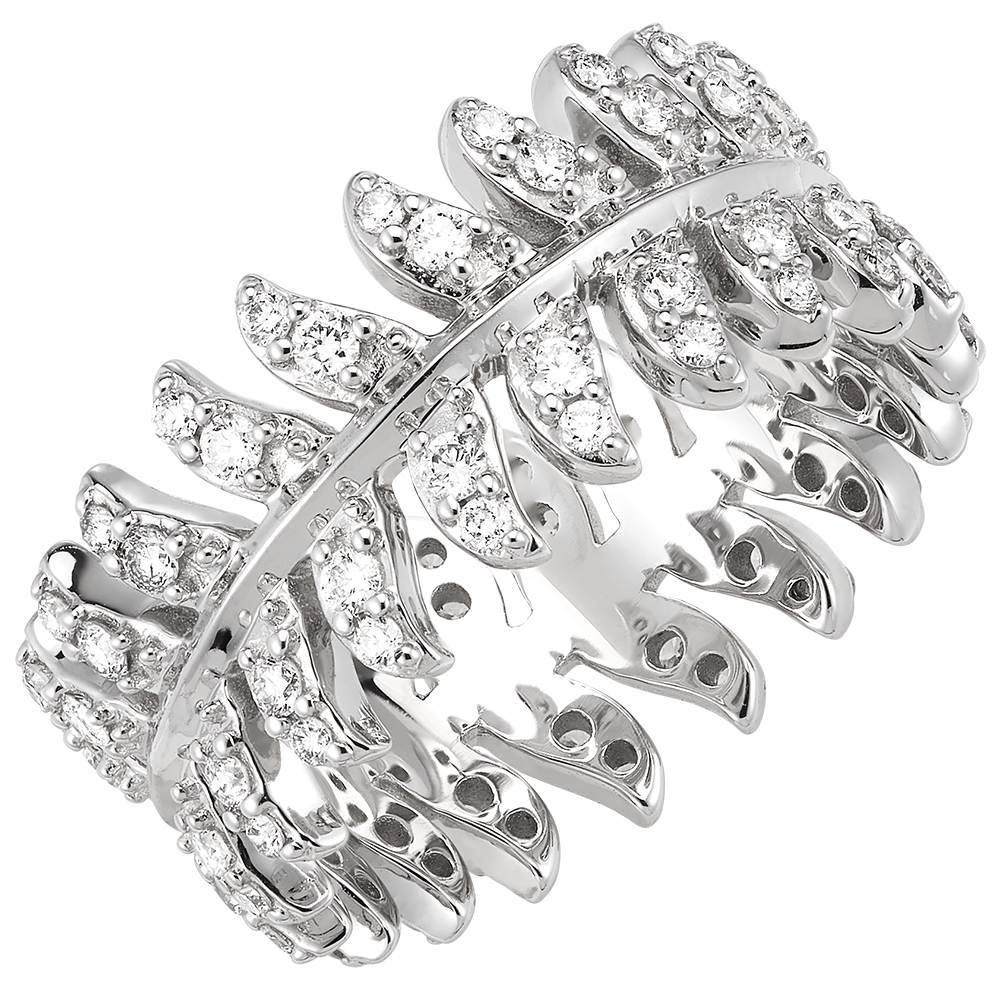 L'anello Révérence in oro bianco 18 carati si distingue per il suo motivo a forma di piuma circolare delicatamente incastonato con 50 diamanti sintetici. Riflettendo lo spirito maestoso della collezione Panache, questo anello è un esempio di raffinatezza e brillantezza, ideale per aggiungere un tocco di splendore alla tua mano.