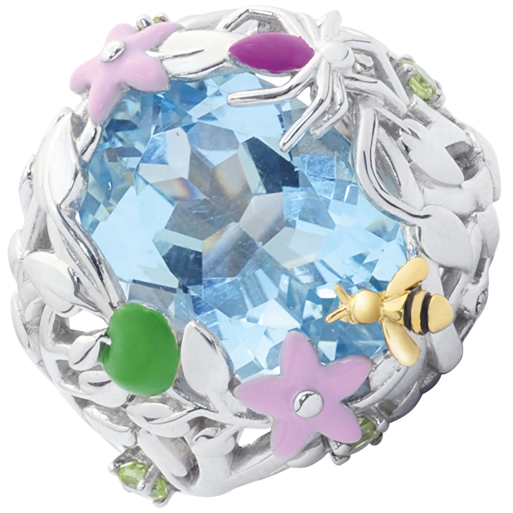 Uno scrigno di foglie abitato da insettini e pieno di frutti custodisce un topazio azzurro. Pietre dure, diamanti e lacca.
