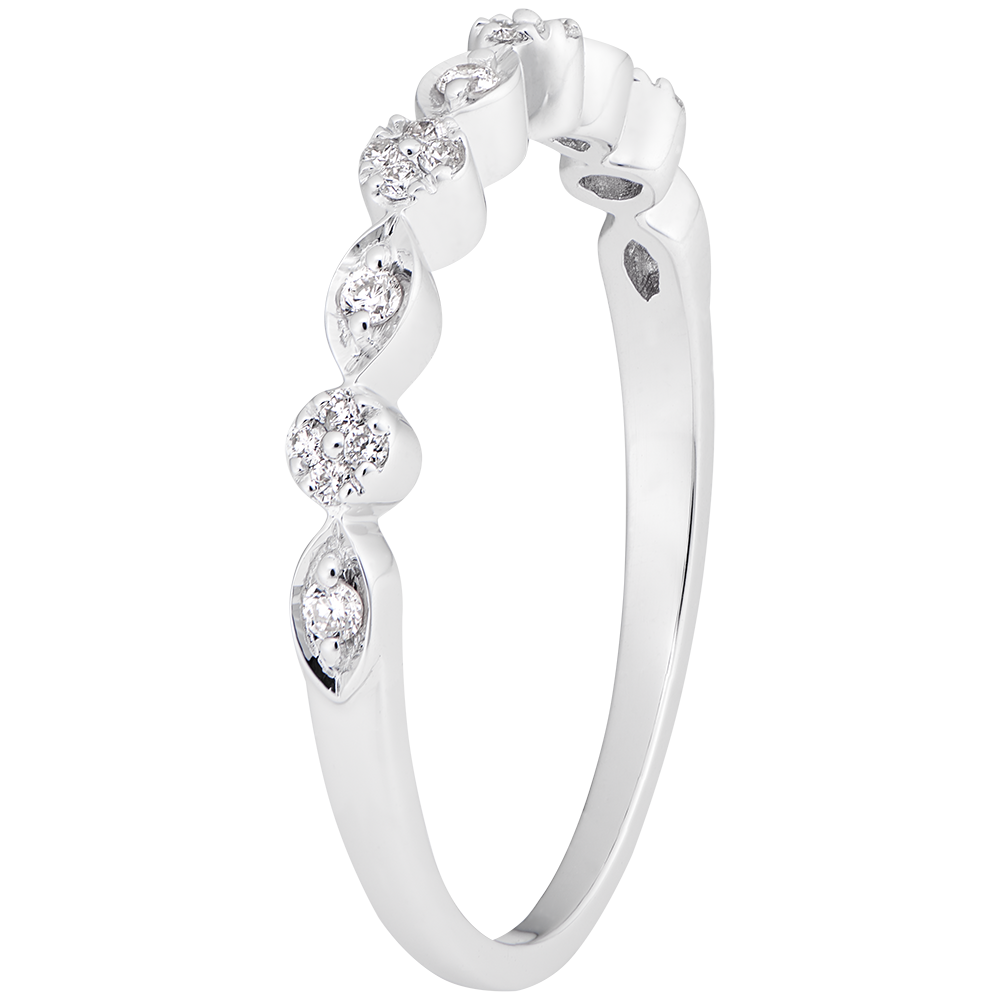 Un anello formato da nappine ovali e rotonde diamantate, molto delicate e femminili. Da indossare solo o abbinato all'anello di fidanzamento, come fede nuziale originale,