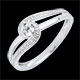 Un diamante solitario poggia su un movimento in Oro bianco liscio, abbracciato appassionatamente da una doppia curva in Oro con lavorazione a diamante.