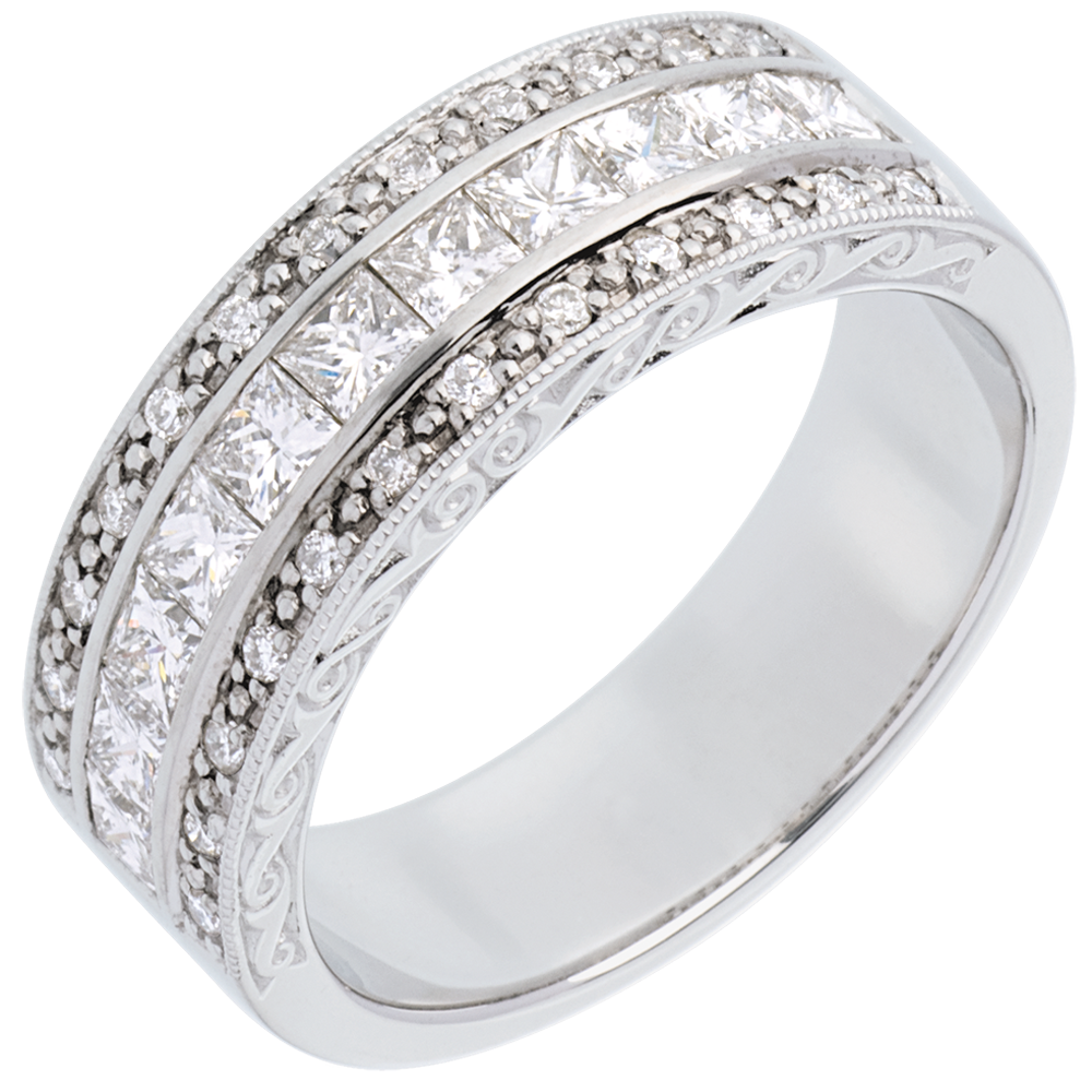 Lussuoso anello pavé a 3 file che alterna diamanti taglio principessa incastonati a binario a brillanti incastonati a grano per massimizzare lo splendore. Un anello elegante e sontuoso.