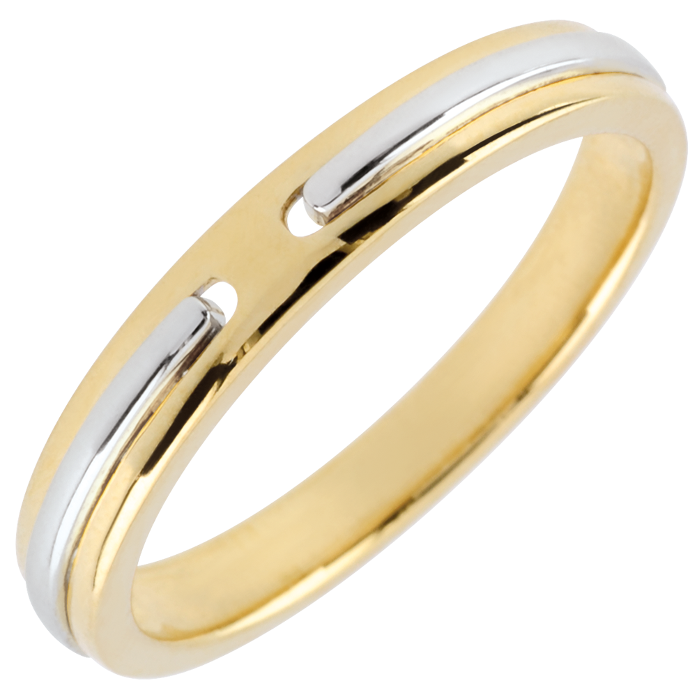 Due linee d'Oro bianco sono unite come una promessa d'eternità racchiusa in un anello in Oro giallo.