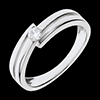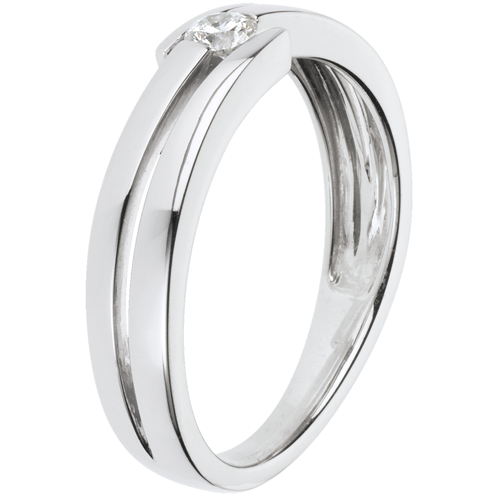 Degli anelli in Oro bianco incorniciano un diamante solitario con perfetta simmetria