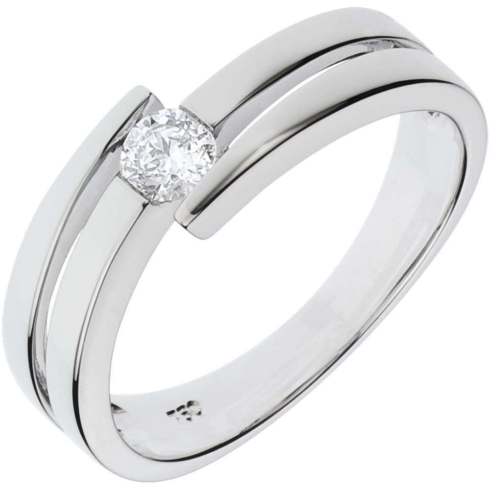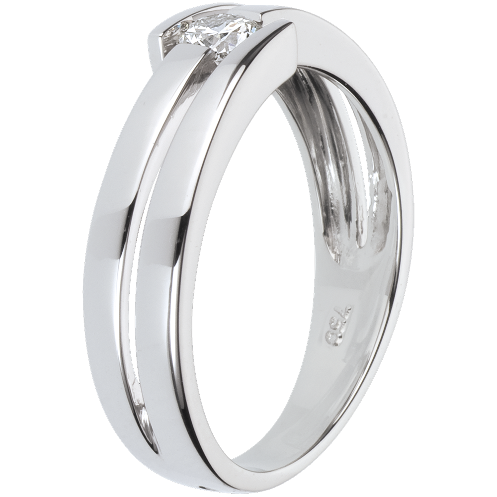 Degli anelli in Oro bianco incorniciano un diamante solitario con perfetta simmetria.